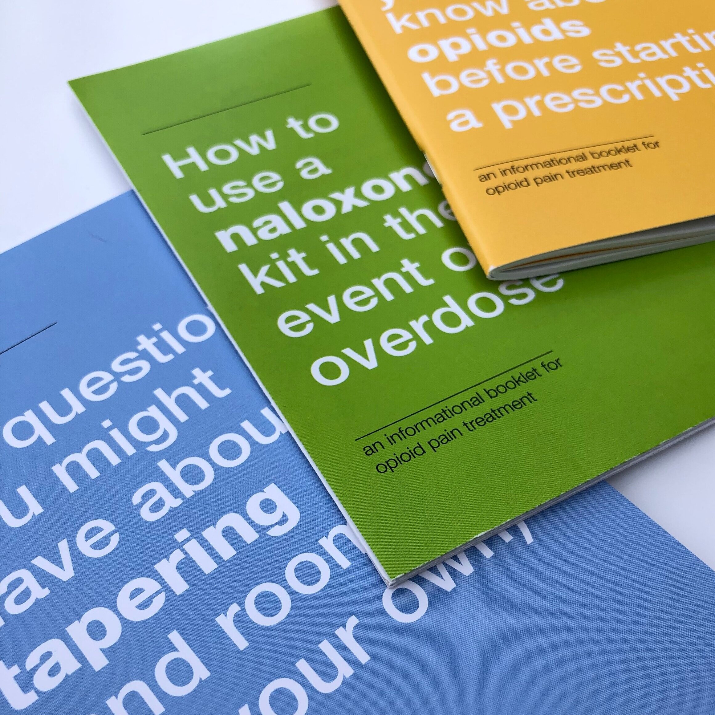 A suite of materials to educate patients about opioids. This trio of informational booklets covers what to know before starting an opioid prescription, what to do in the event of an overdose, and how to begin tapering off opioids.